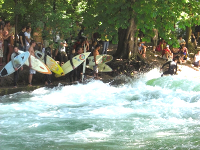 Englischer Garten in München und Surfer auf dem Eisbach
