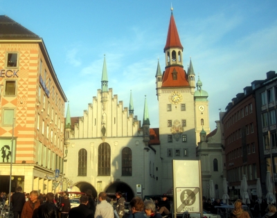 Viktualienmarkt Neben dem Alten Peter liegt der Viktualienmarkt, der im Sommer auch sehr gut für eine Pause geeignet ist, da sich ein großer Biergarten unter Kastanien in seiner Mitte befindet. Auf dem Viktualienmarkt wird von Käse bis Fisch alles angeboten, was das Herz begehrt. Natürlich auch bayrische Schmankerl. Neues und Altes Rathaus Zurück auf dem Marienplatz kann man hier das verzierte Neue Rathaus im neugotischen Stil bewundern. Auf dem Balkon des Rathauses feiert der FC Bayern München seine Meisterschaftsgewinne. Das weltberühmte Glockenspiel, dreht sich täglich um 11 und 12 Uhr, sowie von März bis Oktober zusätzlich um 17 Uhr im Rathausturm und ist ein beliebtes Fotomotiv.