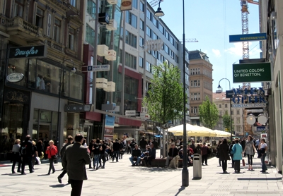 Nun kann man gestärkt die Kärtner Straße entlang bummeln und einen Schaufensterbummel entlang der vielen Geschäfte machen. Man kommt direkt auf die Staatsoper zu. Wer sich vorher noch nicht gestärkt hat, kann im Hotel Sacher auch eine Sacher Torte geniessen. Das Hotel liegt direkt gegenüber der Staatsoper.