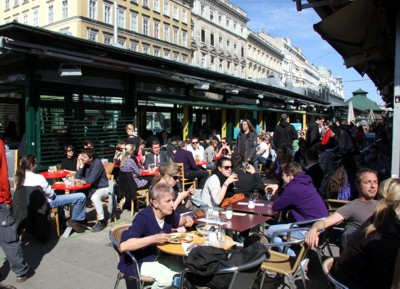 Auf den Naschmarkt gibt es viele Restaurants in den kleinen Pavillons mit Schanigarten. Hier zu essen bietet ein besonderes Flair. Hier trifft sich abends in den kleinen Lokalen mit weißen Tischdecken, wer gesehen werden will.
